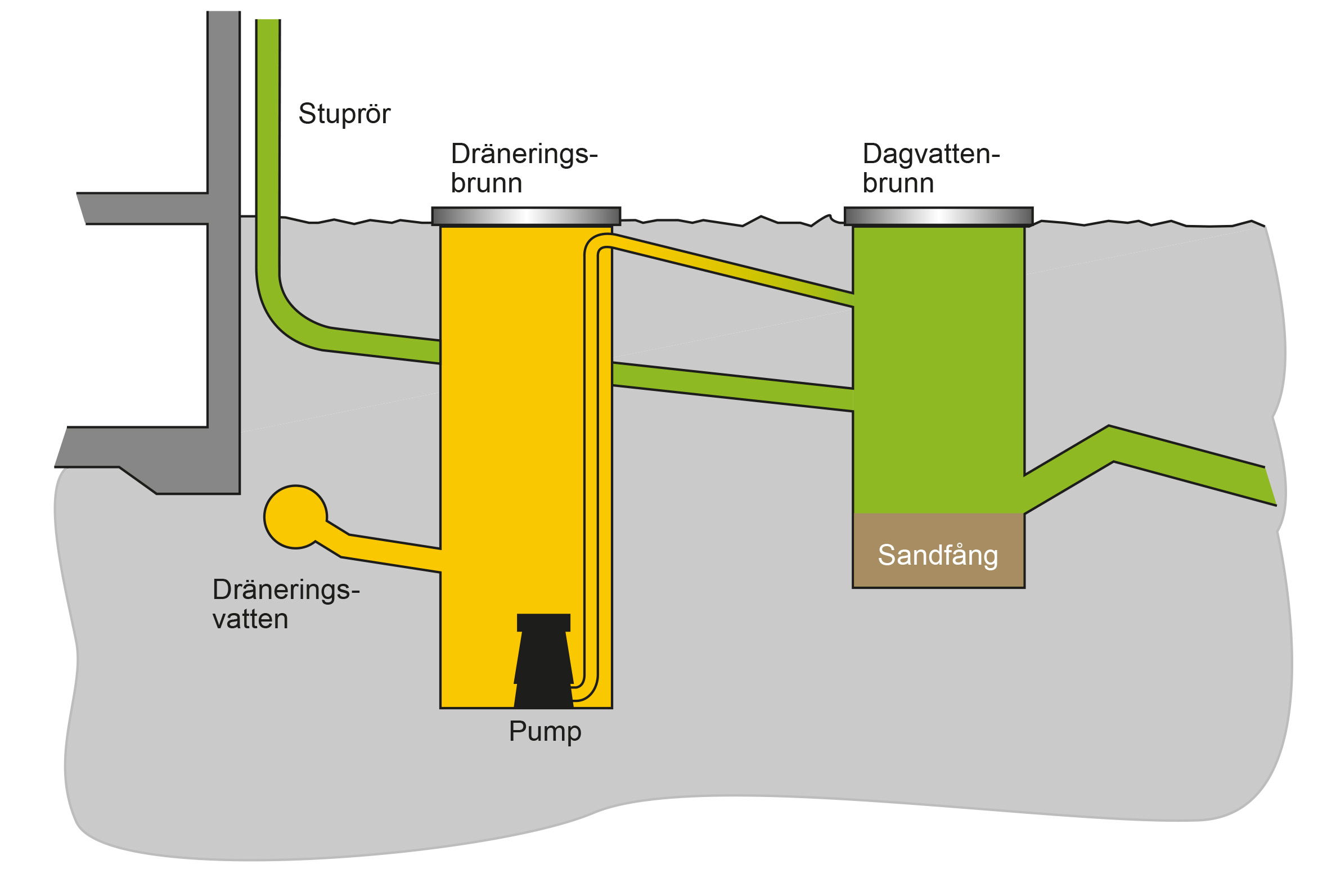 Observera! Dräneringsvattnet ska aldrig kopplas till spillvattenledningen.