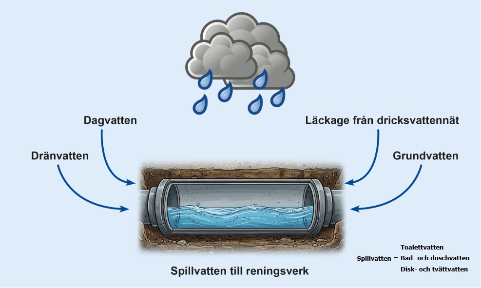 - Grundvatten: Vatten som tränger in via otäta skarvar i rör, trasiga brunnar eller trasiga rörledningar.