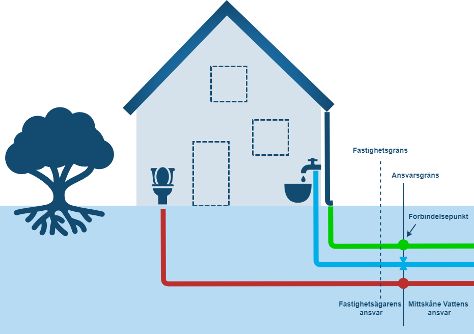 Förbindelsepunkten är gränsen mellan den allmänna VA-anläggningen och fastighetens egen VA-installation. I normalfallet placeras förbindelsepunkten ca 0,5 m utanför fastighetsgränsen. Fastighetsägaren ansvarar för ledningarna inom fastigheten fram till förbindelsepunkten, se bild 1 och 2 nedan.