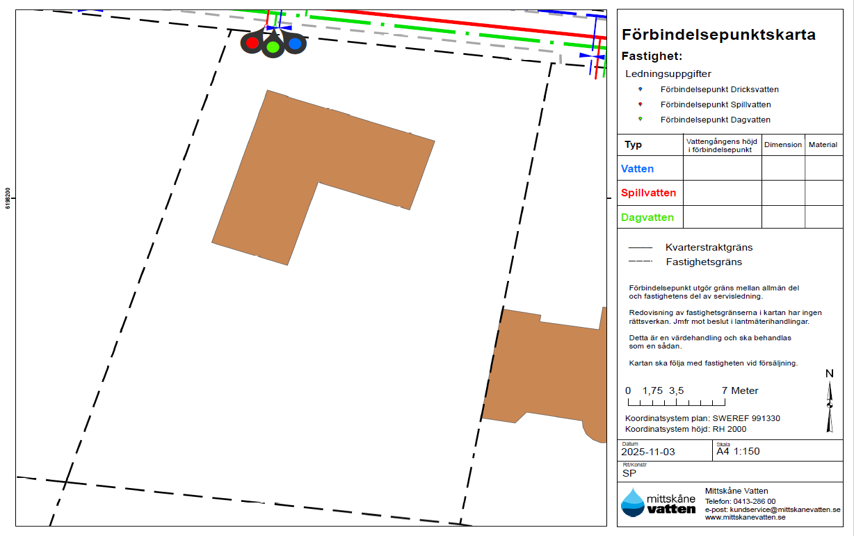 När vi upprättat din förbindelsepunkt skickar vi ut en förbindelsepunktskarta som visar var din fastighet ansluts till det kommunala vatten- och avloppsnätet. Den markerar även gränsen mellan Mittskåne Vattens ansvar och ditt ansvar som fastighetsägare.