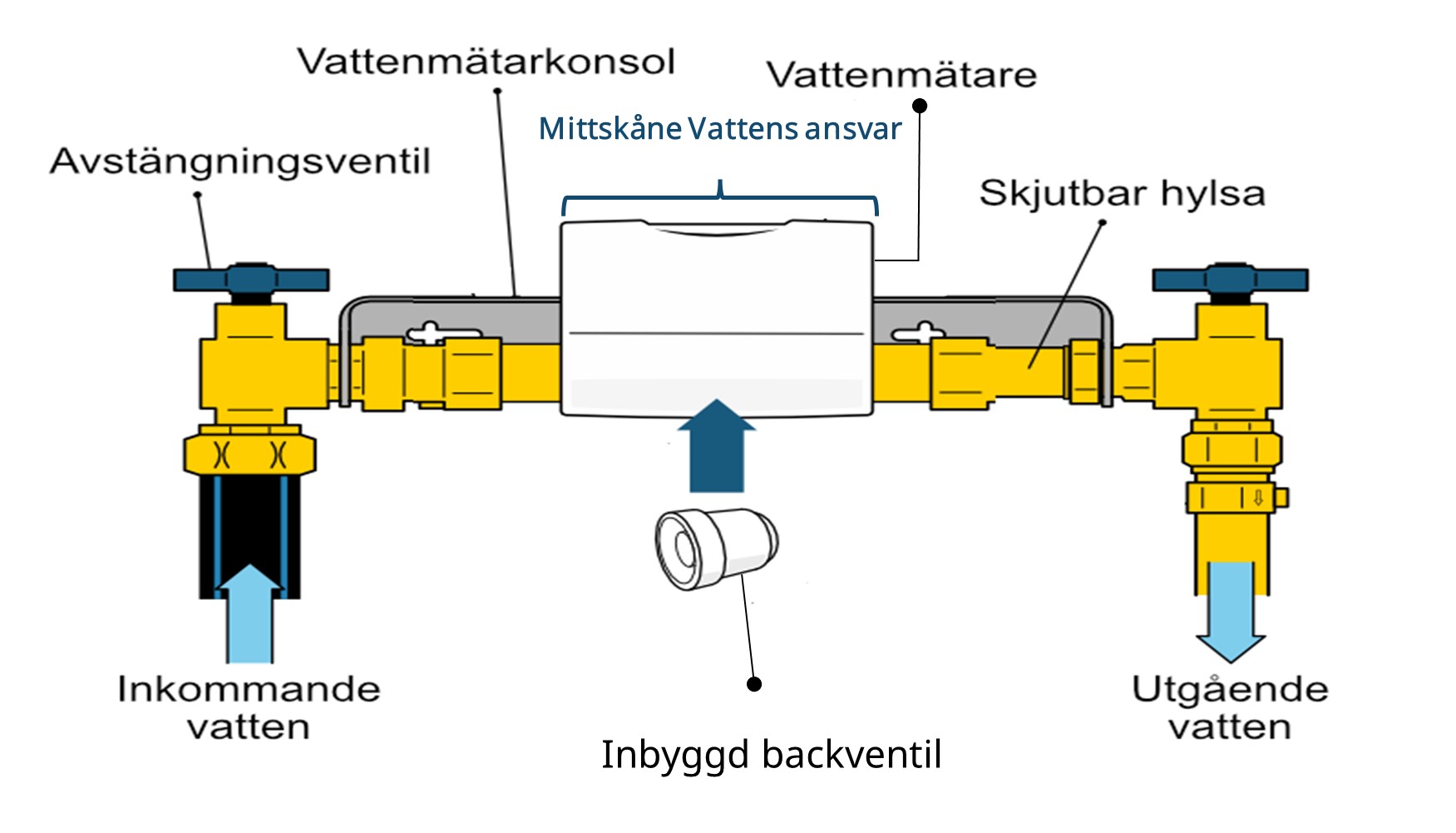 Vattenmätaren tillhandahålls och installeras av Mittskåne Vatten. Det är också Mittskåne Vatten som äger mätaren, även om den sitter i din fastighet. Men tänk på att det är du som fastighetsägare som är ansvarig för att se till så att mätaren inte skadas. Du är också skyldig att upplåta plats för mätaren samt för att lämna Mittskåne Vatten tillträde till fastigheten för kontroll och byte av mätaren.