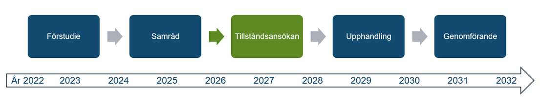 - 2028–2029: Upphandling och projektering